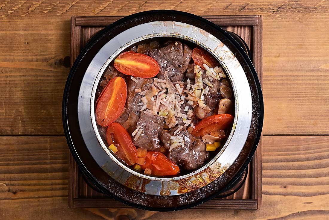 - 【釜の場合】:浸水させた米を釜に入れてから、水を60~80mlくらいを目安に入れる。(水の量はお好みで調整してください)【A】の調味料等を加えて軽く混ぜ、マッシュルーム、玉ねぎ、ニンジン、牛カルビ、ミニトマト、ニンニク、バターをのせ、固形燃料に着火、炊飯する。