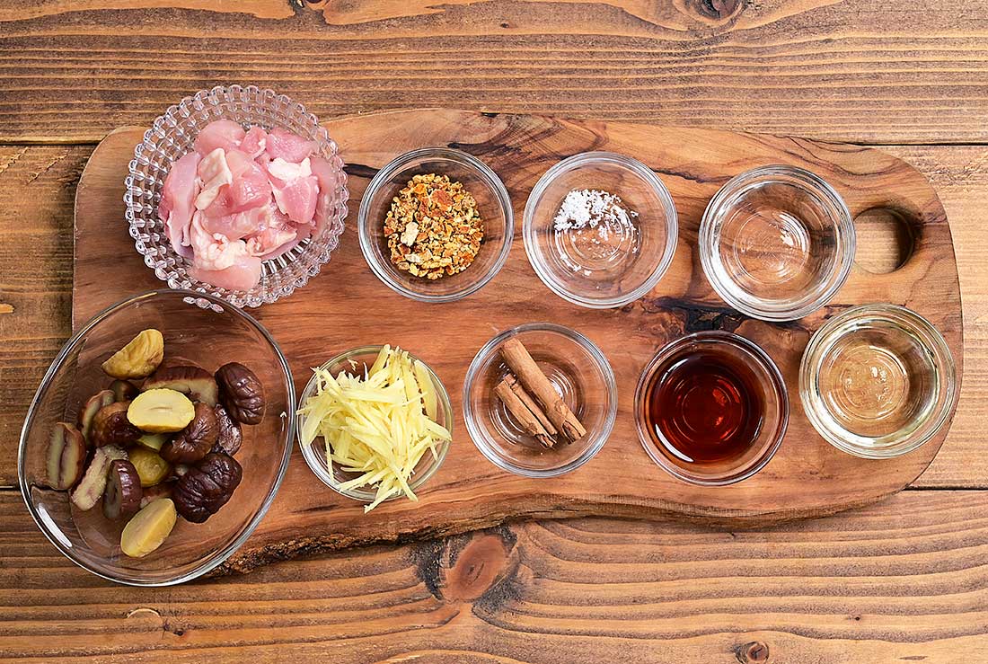 - 米は洗って浸水させておき、鶏もも肉は食べやすい大きさに切り、焼き栗は半分くらいに切る。生姜は千切り、シナモンは半分に折り、陳皮は軽く水で洗っておく。