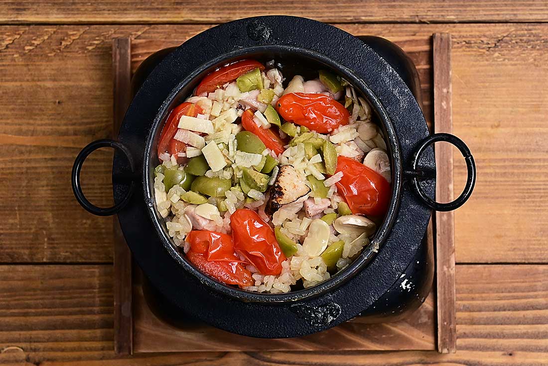 - 【釜の場合】:浸水させた米を釜に入れてから、水を140~160mlくらいを目安に入れる。(水の量はお好みで調整してください)【A】の調味料等を加えて軽く混ぜ、マッシュルーム、鶏もも肉、ミニトマト、オリーブ、ニンニクをのせ、固形燃料に着火、炊飯する