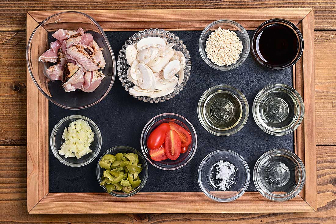 - 米は洗って浸水させておき、マッシュルームは薄切りに、鶏もも肉は食べやすい大きさに切ってお好みでバーナー等で皮目に焦げ目をつける。ミニトマトは半分~4等分に切り、オリーブはタネをとり細かく切り、ニンニクはみじん切りにしておく。