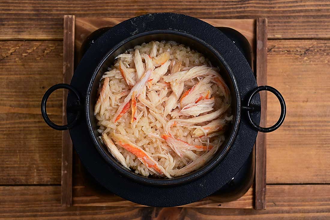 - 【釜の場合】:浸水させた米を釜に入れてから、昆布出汁を150~170mlくらいを目安に入れる。(昆布出汁の量はお好みで調整してください)【A】の調味料等を加えて軽く混ぜ、ズワイガニ脚肉、バターをのせ、固形燃料に着火、炊飯する
