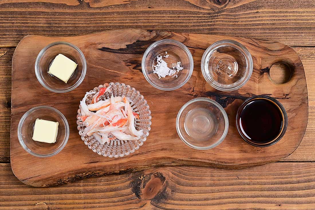 - 【釜の場合】:浸水させた米を釜に入れてから、昆布出汁を150~170mlくらいを目安に入れる。(昆布出汁の量はお好みで調整してください)【A】の調味料等を加えて軽く混ぜ、ズワイガニ脚肉、バターをのせ、固形燃料に着火、炊飯する