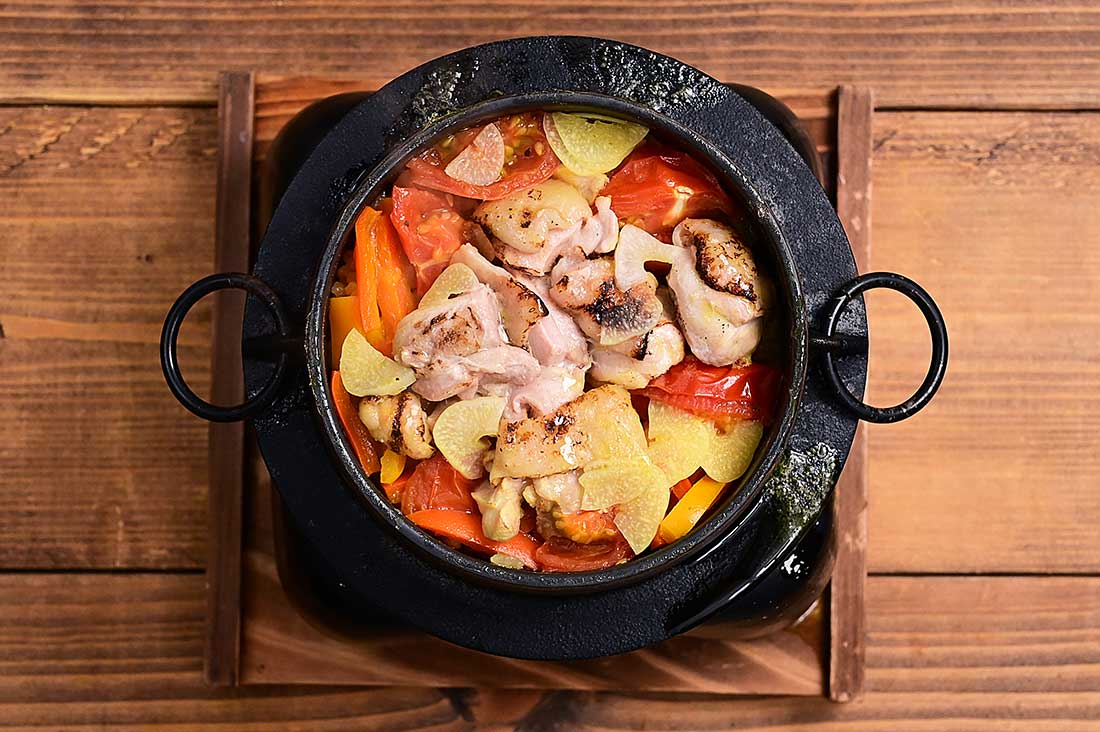 【土鍋の場合】:浸水させた米を土鍋に入れてから、水を180~200mlくらいを目安に入れる。(水の量はお好みで調整してください)【A】の調味料等を加えて軽く混ぜ、玉ねぎ、パプリカ、トマト、鶏もも肉、ニンニクをのせる。鍋の蓋をした状態で中火にかけ、水が沸騰したら火を弱火にし15分くらいご飯を炊く。蓋を開け水がなくなっていたら炊き上がり(蒸気が上がらなくなるタイミングが目安です)。