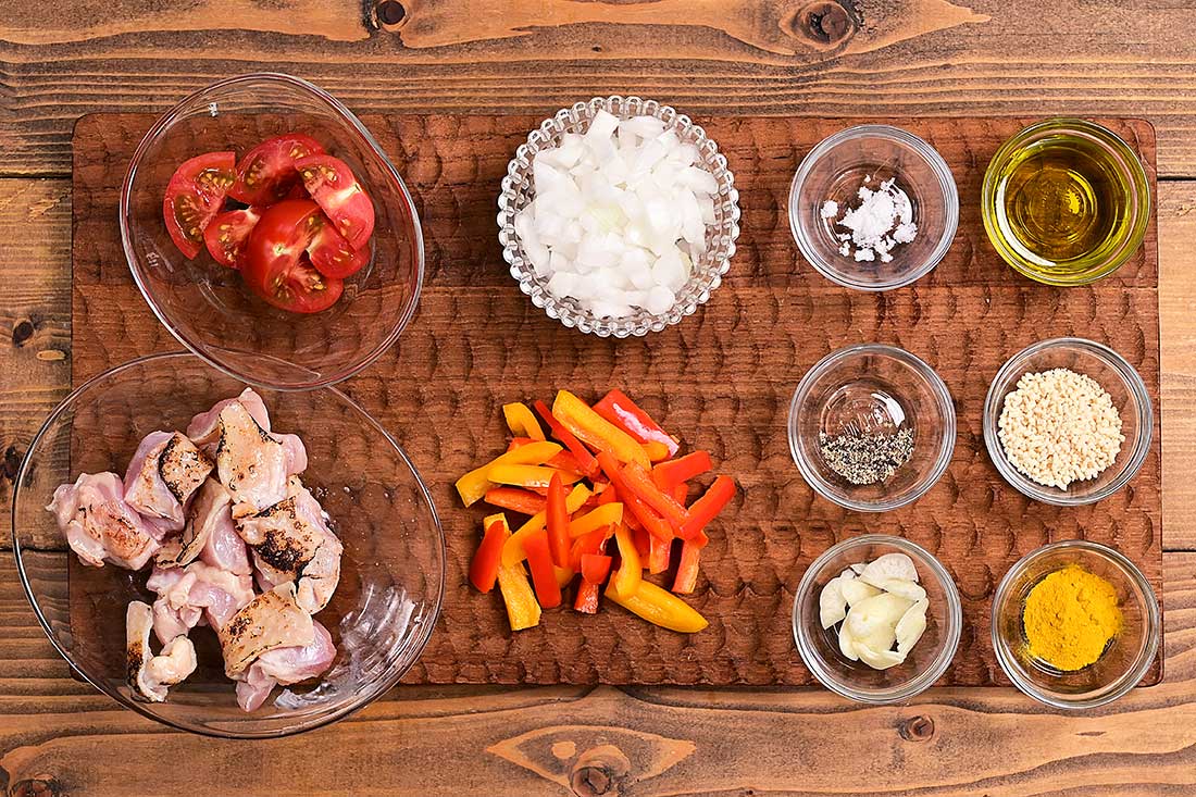 - 米は洗って浸水させておき、玉ねぎはみじん切りにし、パプリカは細切り、トマトは半月切りにする、鶏もも肉は皮目をバーナーなどで焦げ目をつけて一口大に切り、ニンニクは薄切りにする。