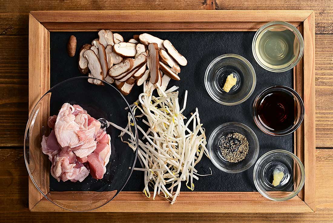 - 米は洗って浸水させておき、シイタケは薄切りにし、鶏もも肉は食べやすい大きさに切っておく。