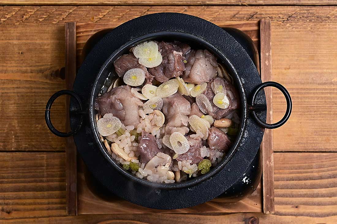 - 【釜の場合】:浸水させた米を釜に入れてから、水を160~180mlくらいを目安に入れる。(水の量はお好みで調整してください)【A】の調味料等を加えて軽く混ぜ、マッシュルーム、牛カルビ肉、ニンニク、バターをのせ、固形燃料に着火、炊飯する