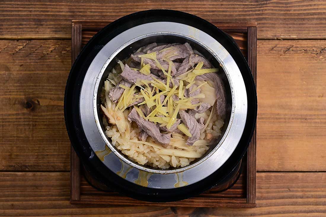 【炊飯器の場合】:浸水した米を炊飯器の内釜に入れてから【A】の調味料等を加え一合分の目盛り少し下くらいまで合わせ出汁を入れたら軽く混ぜる。用意したエリンギ、ゴボウ、漬け込んだ鹿肉、ショウガをのせて普通に炊飯する。 - 炊きあがったら底からひっくり返すようにふわっと切るように混ぜ、蓋をして10分蒸らしたら取り出し器に盛る。お好みで柚子の皮を添える。