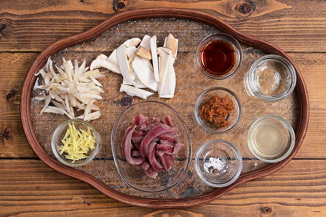 - 米は洗って浸水させておき、エリンギを短冊切り、ゴボウ、ショウガを千切り、漬け込んだ鹿肉を細切りにしておく。
